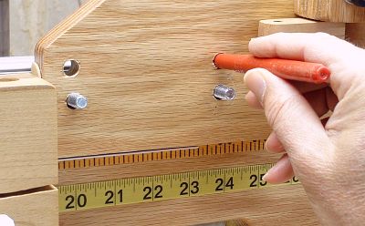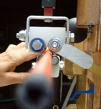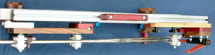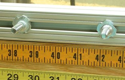 Mark this position on the beam using a marker or pencil through the middle of the unused pair of holes.Release the cam clamps, and carefully slide the beam to the right until the "wand" is clear of the rotator board. While you do this, use your hand as a "clamp" to hold the toggle board in the same position relative to the beam. Carefully lift the toggle board off the bolts, being sure not to move the bolts in the beam slot. Actually, it is no disaster if the bolts move a little in the slot. Remember, you marked their position on the beam. Compare the bolts' position with the marks you made on the beam and, if necessary, slide the bolts in the slot so they line up with the marks. |