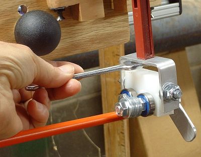 align the direction of the front bearing with the shaft tip.With the beam length at 43, insert the shaft and close the toggle clamp to bend the shaft. Rotate the shaft in the bearings (with your fingers as shown in the earlier photos), while you watch the bearings in the front bearing assembly. Each of the four bearings should turn in response to the turning of the shaft. If any of the bearings do not turn, the yoke needs alignment. Here's how to do it. Use an open-end wrench to slightly loosen the bolt that holds the aluminum yoke to the tip of the toggle clamp. Rotate the shaft while you turn the yoke. Find the position of the yoke where all four bearings turn, and tighten the bolt in that position. Check to make sure it is still in position after being tightened. |