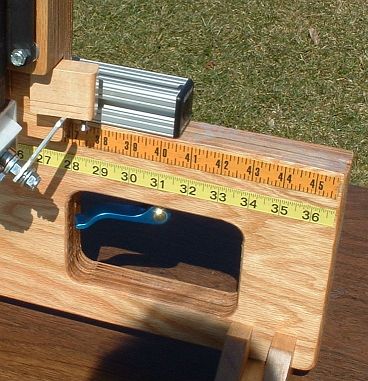 Place the toggle board in the upper (profiling) position. Set the beam length for 19".Find a fairly long (46" or so) wood shaft, that is as straight as possible. Any residual bend will jeopardize the accuracy of the results. As you go through the process, you will be able to judge how straight the shaft is. You may choose to switch shafts in the middle, to find a straighter one. That's OK; you will not have wasted much time doing the early work with a less-straight shaft. With the toggle clamp wide open and the tip stop out of the way, slide the shaft into the bearings from rear to front. Slide it in until the butt is within an inch or so of the rear bearings. There will be a lot of tip sticking out in front of the front bearings. The shaft should sit in the bearings of its own weight, since there is so much tip hanging out the front. Sight along the shaft from the front. It should look something like the photo. Ideally, the shaft will be centered between the bearings of the front bearing assembly. The alignment in the photo is pretty good, but the shaft is slightly to the right of center. |