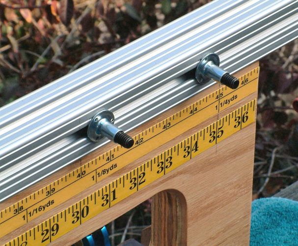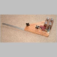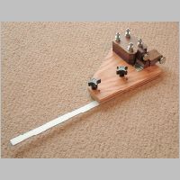 hardboard on the tabletop) rule two parallel lines exactly 10" apart.Apply contact cement to the aluminum strip where it meets the slot on the back of the toggle board, and to the slot as well. When it is tacky, place both pieces on edge on the tabletop, with the tip of the aluminum on one line and the tip of the toggle board on the other line. (See diagram) Bring the tacky surfaces together in this position. That way, the bottom of the toggle board and the bottom of the aluminum strip will be in exactly the same plane, and the extended wand will be exactly 10" long. Secure the aluminum to the backer board with the flat-head wood screws. |