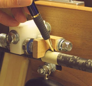 measure.) 2. Secure the toggle board in its lower position, for maximum throw of the toggle. 3. Place the shaft in the bearings, with the tip against the tip stop and the middle bearing block in the "bearings" position. 4. Add a strip of masking tape around the shaft, directly under the shaft marking guide. The easiest way to do this is to place the end of the tape against the shaft, then wrap it on by spinning the shaft in the bearings. 5.